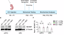 Wild-type C57BL/6 J male mice (7-week-old) were placed in an induction anesthesia box and anesthetized with 3% isoflurane. The mice were then placed in the stereotaxic frame with 1% isoflurane, and an incision was gently made to create a small burr hole. We injected 0.2 µL NEK4 overexpressing AAV or control (5 × 1012 GC/mL) vectors to each site of the dorsal hippocampus (anteroposterior [AP]: −2.06 mm; mediolateral [ML]: ±1.50 mm; dorsoventral [DV]: −1.50 mm) with an infusion rate of 60 nL/min to prevent tissue damage. During surgery, erythromycin eye ointment was placed on the eye to avoid corneal dryness. After surgery, the incision was sutured, cleaned, and injected with buprenorphine (0.1 mg/kg) and carprofen (5 mg/kg) for analgesic and anti-inflammatory effects. Following these procedures, mice were placed on 37 °C heating pad until they regained normal mobility. The anti-flag antibody (#14793S, Cell Signaling Technology) was used to detect NEK4 expression in NEK4 OE mice via Western blot (Supplementary Fig. 5B).