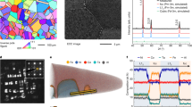 Room temperature uniaxial tensile tests were carried out using flat dog-bone-shaped specimens with an initial strain rate of 1 × 10−3·s−1. Tensile specimens with dimensions of 20/10 mm (total/gauge length) × 2 mm (gauge width) × 1 mm (thickness) were cut from the alloy sheets along the rolling direction (RD) using electrical discharge machining. The surfaces of the specimens were ground to 1000 grit using SiC paper before the tension tests. The local strain evolution and distribution during tensile testing were recorded using the digital image correlation (DIC) method. Charpy impact tests at room (300 K) and cryogenic (93 K) temperatures were performed using a Zwick/Roell machine (RKP450, Germany) on a Charpy V-notch (CVN) specimen with dimensions of 27 mm (length) × 4 mm (width) × 3 mm (thickness). The specimens were machined along the RD with the 60° notch perpendicular to the rolling plane. The geometry of the specimen is based on a European standard (EN 10045-1). A K-type thermocouple was used to measure the temperature during the test. Nanoindentation experiments were performed using an in situ nanoindenter (FT-NMT04, Femtotools, Buchs, Switzerland) with a diamond Berkovich tip. The frame stiffness and area function of the nanoindenter were calibrated using fused silica as a reference material32. The elastic modulus and hardness of the A-MCA material were measured using a continuous stiffness measurement (CSM) method33. The strain rate was kept constant at 0.025 s−1 during the test, and the indentation depth increased from 400 to 1500 nm.