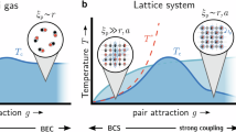 The product of ξ∥ and kF,∥ shows that the transition goes from a BCS regime, where ξ∥kF,∥ >> 1, to a BEC regime at the summit of the dome, where ξ∥kF,∥ → 1 (see Fig. 5b). This result is to be compared with the theoretical picture of the BCS-BEC crossover shown in blue in Fig. 5b. aF is the positive scattering length40 In the weak-coupling BCS regime40, the inter-pair coherence length ξ decreases. In the strong-coupling BEC regime, when \({({k}_{F}{a}_{F})}^{-1}\ge 1\)40, the interaction increases further, but ξ ceases to decrease. This is consistent with our observation of the decrease in ξ∥ followed by its saturation. Furthermore, at the BCS-BEC crossover, ξkF shows a minimum at ≈0.6. In the case of graphite, this corresponds to ξ = 1.53c, broadly consistent with the saturation of ξ at ≈2c found in Fig. 5a. Consequently, the results are not only qualitatively similar (Fig. 5), but they also quantitatively align with the theoretical predictions. A discussion of the in-plane length scale is provided in the Supplementary Note 7.