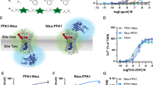 To validate our molecular mechanism for ICL2-mediated signaling, we conducted several in vitro experiments. First, a key component of our proposed mechanism is that AP8’s carboxylate group forms polar interactions that hold ICL2 in a conformation favorable for G protein signaling (Fig. 2). We reasoned that a mutation to FFAR1 that introduces a carboxylate in a similar position could increase constitutive activity of the receptor, effectively mimicking AP8’s interactions. We chose to mutate glycine 103 (3.49 in the Ballesteros–Weinstein numbering scheme), which is directly adjacent to the AP8 carboxylate binding site, to glutamate. Simulations of the G3.49E mutant showed the carboxylate sidechain of E3.49 indeed often forms the same interactions as the AP8 carboxylate (Fig. 4c). IP1 accumulation assays in HEK293 cells expressing FFAR1 were used as a measure of Gq-mediated signaling. The G3.49E mutation significantly increased basal activity (normalized for receptor surface expression) in agreement with the proposed mechanism (Fig. 4d, Supplementary Table 1)36. By contrast, mutating G3.49 to residues that could not form these hydrogen bonds—including aspartate, whose carboxylate does not extend far enough, as well as leucine and alanine—decreased basal activity (Supplementary Table 1, Supplementary Fig. 14c).
