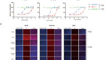 a, b Immunoblot analysis of lysates of bone marrow-derived macrophages (BMDMs) isolated from WT or Tank/Azi2DKO mice and stimulated with TNF (100 ng/ml) as indicated. A representative experiment (a) and quantification of three independent experiments using BMDMs independently isolated from 3 animal pairs. Data were normalized to the maximal response of WT cells, mean ± SEM (b). Statistical analysis was based on the AUC for each cell line, unpaired two-tailed t-test. c, d RNAseq analysis of WT and Tank/Azi2DKO BMDMs stimulated for two hours with TNF (100 ng/ml). The BMDMs were independently isolated from 3 pairs of animals, and RNA was isolated in five separate experiments. Heatmap shows the expression of selected TNF-responsive genes (c). Gene set enrichment analysis (GSEA) shows the enrichment of 105 genes induced by TNF stimulation (log2 fold change > 1 and padj < 0.01; samples from WT and Tank/Azi2DKO BMDMs were analyzed together). The ranked gene list represents the contrast between unstimulated Tank/Azi2DKO and WT BMDMs (blue) or stimulated Tank/Azi2DKO and WT BMDMs (red). The p-value was estimated using an adaptive multi-level split Monte-Carlo scheme in the fgsea R package (d). e Analysis of cell death induced upon TNF (100 ng/ml) stimulation of WT or Tank/Azi2DKO BMDMs. Induction of cell death was detected via the Incucyte imaging system. Mean + SEM from eight separate experiments using samples isolated from 4 animal pairs, two-way ANOVA with Tukey’s post-tests. n.s., not significant. #, nonspecific band.