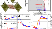 To further investigate the finite-temperature behavior of the chiral Hamiltonian in Eq. (1), we study the temperature evolution of the (equal-time) spin-structure factor in three distinct temperature regimes: one for temperatures above the double-bump features, one chosen within the temperature window comprising the double bump, and a temperature well below these features where we use both MC and IM to improve the statistics of the measurement (we refer the reader to the Supplementary Information (SI) for the precise expressions of the correlation functions). The resulting structure factor is shown in the [hhℓ] and [hk0] planes in Fig. 5 for the three temperatures considered. At high temperatures, broad features are observed indicating an uncorrelated paramagnetic regime, see Fig. 5a. As the temperature is decreased, these features sharpen up and lead to two-fold pinch points4,9,10,11,35,36,37,38,39, see Fig. 5b, resulting in connected bow-tie and diamond patterns in the [hhℓ] and [hk0] planes, respectively. The two-fold pinch points reflect dipolar correlations between the spin degrees of freedom and are indicative of an energetically imposed Gauss’ law constraint on certain gauge fields B(c), namely ∇ ⋅ B(c) = 0, describing an effective low-temperature theory of the system5,39. In particular, within the double-bump temperature window, additional features in the diamonds and bow-tie patterns appear. These anisotropic features become more pronounced as the temperature is lowered below the double-bump window resulting in a cross-like pattern in the [hk0] plane and a dip along the direction of the two-fold pinch points in the [hhℓ] plane, see Fig. 5c.