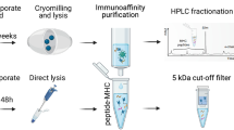 JY cell line (human lymphoblastoid B-cells) was purchased from ATCC and cultured in RPMI 1640 supplemented with 10% FBS and 1% pen/strep. Anti-human HLA-A, -B, -C (W6/32, #BE0079) was purchased from BioXcell, Polyprep chromatography column (#7311553) and Combined inhibitor EDTA-free (#A32961) from Bio-Rad and Solid phase extraction disk ultramicrospin column C18 (#SEMSS18V, 5–200 µl) from The Nest Group. 1.5 ml and 2.0 ml microcentrifuge tubes (Protein LoBind Eppendorf #022431081 and #02243100), Low retention tips Eppendorf (10 µl #2717349, 20 µl #2717351, 200 µl #2717352), acetonitrile (#A9964), trifluoroacetic acid (TFA, #AA446305Y), formic acid (#AC147930010), chaps (#22020110GM), PBS (Buph, phosphate buffer saline packs, #28372), CNBr activated sepharose 4B (#45000066) and ammonium bicarbonate (#A643-500) were purchased from Fisher.