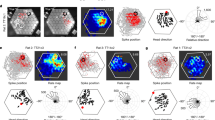 We performed modified versions of the standard rotation correlation analysis47,48,49 to quantify the degree of rotation of place fields and LV fields relative to the platform center and relative to the landmark locations. It was not always straightforward to define algorithmically a field as a place field vs. an LV field in these experiments, as the firing patterns were often complex and variable, especially when there were multiple landmarks in the environment and complex responses to cue rotations (e.g., some LV fields turning on or off, or jumping from one landmark to another). We thus chose to measure the degree of rotation of all firing fields (both putative place fields and putative landmark vector fields) around the center of the platform and around the centers of the landmarks and analyzed the population statistics of these measures to look for statistical effects from the entire cell population (see Supplementary Fig. 7 for secondary analyses of putative individual LVCs identified by subjective, visual inspection). To calculate rotations relative to the center of the platform, we rotated the rate map of the standard session in 1° increments and, for each increment, calculated the number of overlapping spatial bins with non-zero firing rate in both the rotated standard session and the cue manipulation session. The platform-centered rotation degree (PRD) was defined as the rotation angle that had the maximum number of overlapping spatial bins (Supplementary Fig. 3, middle column). For rotations relative to the landmarks, we extracted a circular rate map (radius = 24 cm) centered on each landmark, to minimize the contribution of calcium events unrelated to that landmark (e.g., firing at the corners of the platform; Fig. 4a). Because LV fields could be anchored to different landmarks in different sessions (e.g., Supplementary Fig. 3c, left column, Supplementary Fig. 4c, d; also ref. 21), we first averaged the firing rate maps of the two landmark-centered circular rate maps (creating combination maps; Fig. 4a and Supplementary Fig. 3). We performed the same rotation analysis on these circular rate maps as for the PRD and calculated the landmark-centered rotation degree (LRD) as the rotation angle that maximized the overlap of non-zero firing rate bins between the standard and rotation session combination maps (Supplementary Fig. 3, right column). Because some putative LV fields produced as few as 1 transient near the landmark (e.g., Fig. 2b), we analyzed all cells that had at least one calcium event in both sessions.