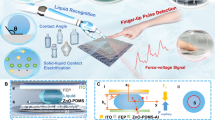 More importantly, the electrification of the liquid and inner wall of the microchannels during the extrusion and release of the sensor naturally constitutes a built-in electric field as well as the bulk charge density. The existence of bulk charge density generated by solid-liquid electrification in microchannel can further increase the sensory performance and the ionic infiltration method has been applied to enhance this bulk charge density. In our previous works, it has been found that selective ion migration can compensate the escape of polarized charge during solid-solid contact electrification (CE)41,42. Hence, in this work, ion-rich interfaces are fabricated to study whether the similar ion transfer effect can enhance the electrification ability on solid-liquid interfaces. Ionic infiltration with different ions is performed on the PDMS film samples and the electrification performance of them is characterized, respectively. The cured PDMS samples are immersed in the NaF, NaCl, FeCl3 saturated salt solution for 3 h and then drying in the oven for 8 h, detailed photos of samples (respectively recorded as PDMS, PDMS-NaF, PDMS-NaCl, PDMS-FeCl3) are shown in Fig. S8. The surface potentials on the PDMS samples before and after treatment are measured as shown in Fig. S9, where the highest potential difference appears on the PDMS-FeCl3. The charges for the CE from the interaction between a sequential of deionized water (DI) droplets and PDMS samples are measured in the single-electrode mode with Cu electrode, as shown in Fig. S10. The detailed working principle of this kind of droplet single-electrode TENG can be seen in previous work43. As the droplet number increased, the accumulated charges on the film surface alternatively and asymmetrically decrease (at contacting) and increase (at separating) until reaching a saturation. The highest amount of accumulated transferred charge and the highest amount of transferred charge in single contact at saturation both appear on the PDMS-FeCl3 (Figs. S11 and 3a), which is about 115.14% and 78.01% improvement compared to untreated PDMS, respectively. Then, the PDMS samples contact with FEP film to test their solid-solid electrification performance, as shown in Fig. S12, where the signals of the treated PDMS are all higher than that of untreated PDMS. The contact angle does not change significantly after this kind of treatment, which can maintain the smooth flow of liquid in the microchannel (Fig. S13).