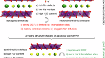 The Vienna Ab-Initio Package (VASP) was employed to perform density functional theory (DFT) calculations within the generalized gradient approximation (GGA) using the Perdew, Burke, and Enzerhof (PBE) formulation55,56. The projected augmented wave (PAW) potentials were applied to describe the ionic cores and take valence electrons into account using a plane wave basis set with a kinetic energy cutoff of 450 eV. Partial occupancies of the Kohn–Sham orbitals were allowed using the Gaussian smearing method and a width of 0.05 eV. The electronic energy was considered self-consistent when the energy change was smaller than 10−4 eV. A geometry optimization was considered convergent when the force change was smaller than 0.03 eV/Å. Grimme’s DFT-D3 methodology was used to describe the dispersion interactions. The equilibrium lattice constants of structures were optimized using a 3×3×2 Monkhorst-Pack k-point grid for Brillouin zone sampling. The U correction had been used for Mn atoms, and it had been set at 4.21 eV. The bonding properties of Mn–O were disclosed by the COHP analysis57,58, as implemented in the LOBSTER code59. The equilibrium lattice constants of NaMnO2 unit cell were optimized. These optimized constants were then used to construct a 2×2×2 supercell model. The Na8Mn11O24 or Na8Mn11MgO24 structures were established with randomly deleting a Mn atom as a vacancy or doping Mg at the Mn position, given the symmetric nature of the Mn-O system. Na8Mn10MgO24 structures were established by doping Mg at the Mn position and Mn in Na position in Na8Mn11O24 structures.