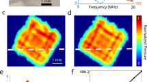 The receiving voltage sensitivity was characterized in the frequency range from 10 to 40 MHz using a calibrated hydrophone (NH0500, Precision Acoustics) and a commercial probe (DOPPLER I2-25P3-H 25 MHz, diameter: 3 mm). The commercial probe was excited by a 10-cycle sinusoidal burst pulse with a peak-to-peak amplitude of 5 V, serving as an acoustic source. The TUTs and the calibrated hydrophone were placed 5 mm away from the source for receiving. The equivalent noise pressure (NEP) was calculated as the ratio of the receiving sensitivity to the noise level57. The noise level was 1.4 mV for both LN- and PIN-PMN-PT-based TUTs, which was calculated from the root-mean-square (RMS) noise recorded by the oscilloscope when the transducer was immersed in water without any acoustic input.