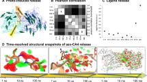 Data were collected at the BioMAX beamline at MaxIV using an Eiger 16 M detector. The X-ray beam was focused to 20 × 5 µm2 (horizontal x vertical) FWHM with a photon energy of 11 keV. For reaction initiation, a 2 ms pulse from a 100 mW 400 nm laser (RLDE405M-20-5 Roithner Lasertechnik) focused to 80 × 200 µm FWHM was offset by ~30 µm from the X-ray focal point. For time-resolved data collection, samples were extruded using a high-viscosity injector84,85 at a speed of 1000 µm s−1. Data were collected at 500 Hz resulting in a distance of 2 µm between exposures. At the flux of 5 × 1012 photons s−1, each 2 ms exposure delivered a dose of about 30 kGy as calculated using Raddose 3D76, remaining well within commonly assumed room-temperature radiation limits77. The chosen balance between dose and extrusion speed allowed to efficiently scan microcrystals54 while making optimal use of the higher flux generated at this next-generation synchrotron source. Collected data were processed with Crystfel 0.10.278,79, using peakfinder8 for peak detection, and XGANDALF80, MOSFLM, and DirAx for peak integration, with the settings: --threshold = 10 –min-snr = 5.4, --min-pix-count = 1. Data was merged and scaled using partialator with the model unity. Mtz files were created with the CCP4 suite74 and isomorphous difference maps for pearson correlation analysis were computed with PHENIX86,87.