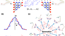 where \(\left({A}_{1},\ldots,{A}_{4}\right)=\left(-10,-5,-8.5,0.75\right)\), \(\left({a}_{1},\ldots,{a}_{4}\right)=\left(-1,-1,-6.5,0.7\right)\), \(\left({b}_{1},\ldots,{b}_{4}\right)=\left(0,0,11,0.6\right)\), \(\left({c}_{1},\ldots,{c}_{4}\right)=\left(-10,-10,-6.5,0.7\right)\), \(\left({\bar{x}}_{1},\ldots,{\bar{x}}_{4}\right)=\left(1,0,-0.5,-1\right)\), \(\left({\bar{y}}_{1},\ldots,{\bar{y}}_{4}\right)=\left(0,0.5,1.5,1\right)\). We performed a Brownian dynamics simulation (time step equals \(2\times {10}^{-4}\), damping factor equals 1) to sample this Müller potential at the temperature of \(0.9\). A reflective boundary condition is adopted: \({x}_{1}\in \left[-1.5,1.2\right]\), \({x}_{2}\in \left[-0.2,2\right]\). The simulation trajectory contains \(3\times {10}^{5}\) frames with the saving interval of 0.01. For alanine dipeptide, we obtained the MD simulation dataset from a previous study84. It contains three 250-ns MD trajectories, with a saving interval of 1 ps. As a result, the entire dataset contains 750,000 MD conformations. All conformations were aligned to the first frame according to the minimal root mean square deviation. The input features consist of the \(x\), \(y\) and \(z\) coordinates of the 10 heavy atoms (totally 30 input features). For the translocation of a DNA motor protein (AlkD) on DNA system, we obtained the MD simulation dataset from a previous study72. It contains 200 50-ns and 100 45-ns MD trajectories, with a saving interval of 20 ps. As a result, the entire dataset contains 725,300 MD conformations. The input features consist of the pairwise distances of 38 atoms, which are constituted by phosphate atoms of five base pairs in the center region of dsDNA and heavy atoms of five protein helixes within 12 Å of nucleotides. See SI Fig. S10 for illustration.