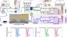 where k denotes the time bins and \({e}^{i{\theta }_{k}}\) describes the relative phases between the prepared pulses. Using this scheme, we generated 4- and 8-level entangled photon pairs featuring a time bin spacing of 64 ps and 32 ps, respectively, which are then spectrally filtered over a 200 GHz bandwidth through a commercially available dense wavelength division multiplexer (DWDM). The picosecond spacing of the spectrally broadband time bins within a prescribed communication frequency channel allows the proposed entangled qudits to reach high quantum information density, which can be defined as dN/(Δt × Δν). In this expression, dN denotes the Hilbert space dimensionality (with d and N being the number of levels and photons, respectively), and Δt × Δν is the TBP of the entire N-photon state (with Δt and Δν being the time-bin width and the bandwidth, respectively). Specifically, we achieved a quantum information density of 42/(0.064 ns × 4 × 200 GHz × 2) ≈ 0.156 for a 4-level state, and 82/(0.032 ns × 8 × 200 GHz × 2) = 0.625 for an 8-level state. As a comparison, for example, microring resonators generating frequency combs of 200 GHz spacing and full-time width of a few nanoseconds18,19,40,41 yield a quantum information density as low as 0.004 for the 4-level state40 and 0.009 for the 8-level state41. We note that a similar quantum information density of 0.148 has recently been achieved for 4-level states, by leveraging a frequency comb spacing as narrow as 15 GHz (yet, within hundreds of ps-large temporal width42), see Fig. 1b,c for further details15,18,19,27,40,41,42,43,44.
