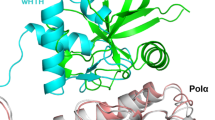 RPA has the paradoxical role of avidly coating ssDNA while selectively allowing proteins involved in DNA replication, recombination and repair to take over and perform their function54. In yeast, Rad52 is a homologous recombination mediator that interacts with RPA to load the Rad51 recombinase onto RPA-coated ssDNA. Single-molecule fluorescence studies suggested that Rad52 can interact with RPA subunits Rfa1 and Rfa2WH resulting in a lower-footprint coating of ssDNA by RPA, thus increasing the overall accessibility of DNA55,56,57. Another study found that the protein-protein interaction domains in eukaryotic RPA can impose structural constraints on its architecture leading to intrinsic dissociation of the trimeric core from ssDNA55. Our results are consistent with these observations, as RPA displacement was promoted by PriSL only when they could interact through the WH domain. Our crystal structure of the Rpa2WH-PriSL complex, validated by in-solution NMR experiments, allowed us to precisely map the PriSL-Rpa2WH interface and build a model of the entire PriSL-RPA interaction on DNA (Fig. 8a), aligned with our previous structure of ssDNA-bound RPA and a primer-template substrate from a PrimPol ternary complex58. The alignment of the structures was made minimizing the distance between the 5’ and 3’ ends of the template ssDNA, as well as the distance between the C-terminal of the Rpa2 core and the N-terminal of Rpa2WH, which are only 8 residues away in the Rpa2 sequence. This model shows the relative orientation of RPA and PriSL when they interact during primer extension, indicating that RPA could optimally tether PriSL to the downstream ssDNA via the WH domain. Based on this model and our primer extension results, we have proposed a PriSL-RPA ‘WH-bait’ interaction model mechanism (Fig. 8b), explaining how RPA can stimulate PriSL. According to this model, PriSL will sequentially bind to the WH domain of the downstream RPA as it elongates the primer, possibly inducing a weaker DNA-binding mode on RPA as has been observed in the Rad51-RPA interaction56, ultimately displacing RPA from the template strand. Our study provides a structural rationale to the formerly proposed general model by which proteins trade places with RPA on ssDNA, inducing conformational changes in RPA that alter its ssDNA-binding properties54. After its displacement, the next downstream RPA WH domain would bind to PriSL, repeating the cycle until the primer-template hand-off to PolD takes place. We speculate that Rpa2WH could play a role in the DNA hand-off, as we found that RPA binds to PolD via a novel interface that remains partially solvent-accessible even as the WH domain is bound to PriSL.