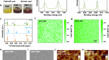 The detailed interconnect structures studied in this work are illustrated in Fig. 1A. Thermally evaporated 8 nm-MoOx within the ICLs is replaced by an ethanol-dispersed PEDOT:F solution that can be spin-casted (~15 nm) onto the hole transporting layer (HTL) formed by a thin D18-Cl layer (molecular structure see Fig. S1). The ICL stack is finalized by evaporating a typical 1 nm-Au layer and subsequently spin-coating layers of ZnO NPs and PFN-Br. We favor Au over Ag, as the latter is known to exhibit adverse effects on the long-term stability of the solar cell, which are related to its diffusivity and easy reaction with iodine from the perovskite bulk30,31,32. Replacing Ag with Au prevents the rapid degradation of the perovskite layer (Fig. S2). In order to understand the impact of different underlying layers on the growth of the Au nanoparticles, the surface properties of MoOx and PEDOT:F on D18-Cl were initially investigated by atomic force microscope (AFM) and contact angle measurements. As shown in Fig. S3, a higher roughness (RMS = 6.17 nm) is observed for the PEDOT:F surface compared to the MoOx surface (RMS = 1.91 nm), which derives from the solution processing of PEDOT:F via spin-coating. Furthermore, organic PEDOT:F exhibits a hydrophobic surface while the surface of MoOx is markedly hydrophilic (Fig. 1B, Fig. S4 and Table S2). Their corresponding surface free energies are calculated based on Wenzel theory, which can concurrently take the surface roughness into account (Fig. 1C; for a more detailed calculation, see Note S1, Fig. S5 and Table S3)33,34. The MoOx films present a high surface free energy (\({\gamma }_{s}\) = 28.32 mJ/m2), comprising polar (\({\gamma }_{s}^{p}\)) and dispersive (\({\gamma }_{s}^{d}\)) components of 28.02 mJ/m2 and 0.30 mJ/m2, respectively. In contrast, PEDOT:F films exhibit distinctly low \({\gamma }_{s}\) of 6.93 mJ/m2, with a significantly decreased \({\gamma }_{s}^{p}\) of 5.26 mJ/m2 and a slightly increased \({\gamma }_{s}^{d}\) of 1.67 mJ/m2. Typically, high surface free energy implies surface atoms are unstable and prone to interacting with other substances, while low surface free energy suggests stability, reducing the likelihood of interaction with other substances. During evaporation, Au atoms preferentially adhere to the high-surface-energy MoOx film rather than to the PEDOT:F surface, owing to a weaker interaction between atomic Au and low-surface-energy PEDOT:F film35,36. Additionally, the high \({\gamma }_{s}^{p}\) of the MoOx film may induce an electric dipole in atomic Au, leading to further electrostatic attraction37. This significant adsorption can reduce the diffusion rate of Au atoms on the MoOx surface, which is consistent with its lower dispersive component \({\gamma }_{s}^{d}\). Therefore, the stronger interaction forces between MoOx and Au atoms facilitate the attachment of Au atoms and simultaneously contribute to a retarded surface diffusion kinetics for evaporated Au atoms onto MoOx film. Conversely, their diffusion behavior on the PEDOT:F surface is diametrically opposed.