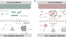 The halide perovskite cathode was first examined in Zn||2 M ZnSO4||(BzTEA)2TeI6 Swagelok cells and achieved with two redox peaks, corresponding to I0/I- and Te4+/Te0, the latter of which experienced fast decay of current according to the cyclic voltammetry (CV) curves in Fig. 1c. In comparison, 2 M Zn(OTF)2, 2 M Zn(OAc)2, and 15 M ZnCl2 electrolytes all failed to activate the redox reaction of high-valent tellurium cations (Supplementary Figs. 9, 10). 30 M ZnCl2, containing reduced amount of free water, was then used as the electrolyte with an attempt to stabilize the tetravalent tellurium cations50. Surprisingly, it enabled the perovskite cathode with an additional Te6+/Te4+ redox at around 1.5 V. It should be noted that the Te6+/Te4+ redox was utterly absent in the “TeO2 + ZnI2” and “Te + I2” cathodes (Fig. 1d and Supplementary Fig. 11), which reveals the special structure of (BzTEA)2TeI6 for activation of the new redox. The observation also suggested that the activity of water and chloride anions may play an essential role in stabilizing high-valent tellurium cations. Based on that, we introduced choline chloride (ChCl) into the concentrated ZnCl2 electrolyte to devise the Ch0.4Zn0.6Cl1.6 · 1.5H2O electrolyte, which was found to have limited water activity and enough mobility of chloride ions to coordinate with high-valent tellurium cations during cycling. As shown in Fig. 1e, the activity endowed Zn||Ch0.4Zn0.6Cl1.6 · 1.5H2O||(BzTEA)2TeI6 prominent discharge peaks, including Te6+/Te4+ and Te4+/Te0 redox pairs at 1 mV. In sharp contrast, both “TeO2” and “Te + I2” cathodes failed to enforce the Te6+/Te4+ redox even when coupled with the same modified electrolyte, again highlighting the special chemical design of (BzTEA)2TeI6 (Supplementary Fig. 12).