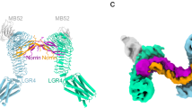 We developed a high-affinity nanobody (NB52) targeting the ectodomain of LGR4 (Supplementary Fig. 1a), which was further expanded into a larger “megabody” (MB52) to optimize the orientation of the particle (Supplementary Fig. 1b, c)34. To stabilize the interaction between ZNRF3 and LGR4 for structural determination, we employed NanoBiT technology35,36. Specifically, fragments of LgBiT and HiBiT were genetically fused to the C-terminus of LGR4 and the RING domain of ZNRF3, respectively (Supplementary Fig. 2a). LGR4 and ZNRF3 were expressed separately, then mixed with RSPO2(Fu) (specifically the Furin domain, which includes two adjacent Furin-like cysteine-rich domains responsible for its function) during extraction, and subsequently purified to form the LGR4-RSPO2-ZNRF3 complex (Supplementary Fig. 2b). Different assemblies were observed in 1:1:1 and 2:2:2 stoichiometric ratios. The cryo-EM analysis revealed that the predominant complex observed was the LGR4-RSPO2-ZNRF3 complex with a 1:1:1 stoichiometry, in comparison to other assemblies. The 1:1:1 particle formation was used for 3D reconstruction, homogeneous refinement, global CTF refinement, and non-uniform refinement, resulting in a reconstruction map at 2.70 Å resolution. Although the RING domain’s density was not visible in the high-resolution maps, it was observed extending into the cytoplasm in low-pass-filtered maps (Supplementary Fig. 2c–e). The 1:1:1 LGR4-RSPO2-ZNRF3 complex was classified as a heterotrimer. In contrast, the 2:2:2 particles accounted for 3.1% of the good particles, and a final map resolution of approximately 6.78 Å was obtained after 3D reconstruction, which was inadequate to achieve a high-resolution model. This 2:2:2 complex is referred to as the di-heterotrimer (Supplementary Fig. 2d).