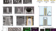 The fabrication process is fully explained in the paper by Jahed et al. 35. Briefly, we used maskless photolithography followed by deep reactive ion etching to develop vertical SiO2 nanopillars, which were then coated with Pt metal to achieve conductivity. The metal was etched from the tip of the pillars using a directional dry etch to achieve the nano crown shape.