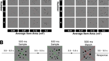 By referencing a preceding study15, other irrelevant stimulus parameters, such as item surface area (the dot size), and total field area (the size of the virtual circle) of the dot arrays, were manipulated independently from numerical magnitudes. The range of numerosities varied across sessions, but the item surface area remained constant at either 0.22π deg2 or 0.2372π deg2, and the total field area was fixed at either 5.922π deg2 or 72π deg2, regardless of the session. Thus, in each session, the dot arrays were defined by 4 (numerical magnitude) × 2 (item surface area) × 2 (total field area) combinations, resulting in 16 unique combinations. These combinations were presented in a random order in each run. Dot positions were also randomized across trials. To prevent the texture-density mechanism from becoming predominant, we ensure that minimum edge-to-edge distance between elements, including the fixation cross, was no less than 0.219 deg. This constraint yielded an average edge-to-edge distance of at least 0.665 deg (mean = 1.173, max = 1.955) and an average center-to-center distance of at least 1.108 deg (mean = 1.610, max = 2.373), facilitating the processing of numerosity primarily through the ANS59. Furthermore, to prevent the luminance of the dot array from being a proxy to estimate numerosity, half of the dots within an array were presented in black, and the rest were presented in white60: for arrays with an odd number of dots (2 N + 1), half the trials featured N white dots and N + 1 black dots, while the other half had N + 1 white dots and N black dots.