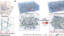 According to the XRD patterns (Supplementary Fig. 6a), the PVA hydrogel alone presented a broad amorphous peak between 15° and 35° while the CNF hydrogel alone displayed a peak at 22.5° corresponding to the reflection plane (200) of cellulose crystalline structure33,34. As for the control hydrogel prepared without CNFs, denoted as HHP-1.5 hydrogel, an obvious peak centered at 19.6° corresponded to the typical reflection plane of \(\left(10\bar{1}\right)\) in semicrystalline PVA, while a shoulder peak at 22.5° belonged to (200) plane of PVA35,36. With the introduction of CNFs, the HHPC-1.5 hydrogel presented the stronger peaks at 19.6° and 22.5°, indicating the enhanced crystallinity induced by more hydrogen bonds among PVA chains and CNFs37. Furthermore, the individual sheath and core were obtained by a careful peeling-off method and carried out for the structural characterization (Supplementary Fig. 6c). A stronger diffraction peak at 19.6° was observed in XRD pattern of the sheath compared to that of the core layer, indicating the higher crystallinity of the sheath induced by the ion concentration gradient (Fig. 2g). The higher storage modulus G’ emerging in DMA curve of the surface was evidence of its higher crystallinity (Fig. 2h)38. Meanwhile, the sheath displayed a stronger endotherm peak at 230 °C in the DSC profiles assigning to the melting of PVA crystals by an increase of 10 °C compared with the inner layer (Supplementary Fig. 6b). Quantitatively, the surface crystallinity was estimated to be 23.2 wt% in a swollen state, far higher than 7.1 wt% of the inner part (Fig. 2i)14,39.