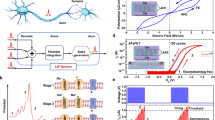 a Schematic of the vertical heterojunction integrating the functionality of the MoS2 / CuInP2S6 / MoS2 memristor and MIS-FET. b Schematic of neurons and chemical synapses. c The energy band diagram of the device in both high resistance state (HRS) and low resistance state (LRS), depicting ferroelectric polarization mode (upper) and ion migration mode (lower), respectively. d The demonstration of the memory windows of a typical S-FE-S memristor. The red arrows indicate the current measured via applying the voltage pulse train (shown in the inset). e The LTP and LTD measured under the ferroelectric polarization working mode. Here, the 40 set (30 reset) pulses are organized into a group, with the voltage ranging from 7 V to 14.5 V (−5 V to −6.6 V) in fixed intervals of 0.5 V (−0.1 V) between distinct groups. Each pulse had a duration of 0.01 s, followed by an interval of 0.4 s with no voltage. Finally, each state was assessed as shown in Supplementary Fig. 4. f Retention characteristics of 16 distinct ferroelectric polarization states. The different states were obtained by the same excitation pulses as in (e). g I–V characteristic of the device while applying a fixed gate voltage of −4 V. The blue arrows denote the switching direction. h The LTP and LTD measured under the ion migration working mode. The bias voltage was programmed by a series of set pulses (−1.5 V, 0.2 s) followed by a series of reset ones (0.22 V, 0.4 s) and each excitation pulse is accompanied by a fixed read pulse (−0.6 V, 0.1 s). i The evolution trend of current with time in different states under a fixed read pulse sequence. Here, distinct ion migration states were achieved utilizing the same pulse pattern as in (h), but with varying numbers. The inset is the replotted segments within the range of 45 s.