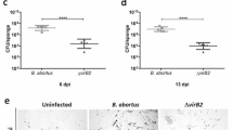 Brucella abortus smooth virulent 2308 strain and a derived transgenic DsRed-expressing strain were used47. All Brucellae were kept, grown, and used under strict biosafety containment conditions throughout the experiments in the BSL3 facility. B. abortus strains were grown on tryptic soy agar plates, and 50 µg/mL kanamycin for the DsRed strain. For infection, strains were grown for 16 h at 37 °C under shaking in tryptic soy broth until OD at 600 nm reached 1.