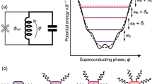 Figure 1 a, b present the realization of the high-impedance nonlinear microwave resonator, and Fig. 1c the corresponding electric circuit. The resonance mode with one-photon resonance frequency of \({f}_{01}\approx 1/2\pi \sqrt{L{C}_{\Sigma }}\) forms from a total capacitance CΣ and inductance L of a JJ. Here, the total capacitance CΣ contains the JJ capacitance, capacitance from the resonator middle line (shown in teal) to ground, and two input capacitances Cc which connect the resonator to input and output lines (shown in blue). The single junction geometry yields orders of magnitude stronger nonlinearity as compared to the JJ arrays5,20,28,32,33 as the full voltage amplitude is across the single junction. We further split the single JJ into a SQUID geometry, Fig. 1b, to tune the value of L with a magnetic field1,5,20. One end of the resonator connects to the ground shown in dark gray in Fig. 1a while the other end (in teal) connects to the input and output ports (in blue) via inter-digitized coupling capacitors.