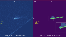 NASA’s Double Asteroid Redirection Test (DART) mission was the first full-scale planetary defense demonstration mission that deliberately crashed a spacecraft into Dimorphos, the smaller satellite of the binary system (65803) Didymos28,29. On September 26, 2022, at 23: 14: 24 UTC, the DART spacecraft (579 kg at the time of impact) successfully impacted at 8.84° S and 264.30° E on Dimorphos in the body’s fixed frame (ISU_DIMORPHOS) with an impact speed of 6.145 km/s28,29. The spatial extent of the pre-impact Dimorphos was 179 m × 169 m × 115 m, indicating a relatively oblate shape30. This impact caused a mutual orbit period change of Dimorphos relative to Didymos of − 33.0 ± 1.0(3σ) min31. After the collision, the ejecta plume evolved with time, exhibiting a cone-like shape that grew initially but later decayed gradually, a major part of which joined as part of the tail mainly driven by solar radiation pressure32,33,34,35,36,37,38,39,40,41,42,43,44. β estimates ranged between 2.2 and 4.9 (depending on the assumed bulk density of the asteroid, which remains unknown but will be constrained by ESA’s Hera mission45); for a bulk density of 2.4 g/cc, β was determined to be \(3.6{1}_{-0.25}^{+0.19}\)46.