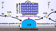 A composite of each M-PCL (30 wt%) with sulfur (70 wt%) were prepared by heating the mixture at 155 °C for 8 h. To prepare the working electrodes, a slurry was fabricated by mixing the sulfur composite with each M-PCL catalyst materials and polymeric binder (LA132, Shandong Gelon Lib Co., Ltd.) in a weight ratio of 9:1 using D.I. water as a solvent. The prepared slurry was coated on carbon-coated Al foil by Doctor blade, and completely dried at 60 °C for 8 h. Then, as-prepared electrode was cut into a coin shape (14 mm) by hand operated punching tool (WC-H125, Wellcos Ltd.). A porous polypropylene-based membrane (Celgard 2400, Wellcos Ltd.) and circular stainless-steel plate with the thickness of 1.0 mm and the diameter of 14 mm were utilized as a separator and spacer disk, respectively. Lithium metal (Honjo Co., Ltd., > 99.9%) with the thickness of 200 μm was used as an anode without any surface-treatment. Battery performance was characterized by 2032 coin-type cell. The 1.0 M bis(trifluoromethane) sulfonamide lithium salt (LiTFSI) in an organic solvent of dimethoxymethane and 1,3-dioxolane (DME/DOL, 1:1 volume ratio, PANAX E-TEC Co., Korea) was used as an electrolyte with 2.0 wt.% of lithium nitrate (LiNO3, 99.99% metal basis, Sigma-Aldrich). For the coin cell test to investigate the cell performance, areal S loading and E/S ratio were fixed to 5.0 mg cm−2 and E/S ratio of 4.5 µL mg-1. For the ex situ SEM, XPS, XRD, and chronoamperometry analyses, cathode with areal S loading of 2.0 mg cm−2 and E/S ratio of 10 µL mg−1 was used. In particular, cell was disassembled in Ar-filled glove box, and the cycled cathode was washed with pure DME and DOL 3 times to completely remove residual salts for ex situ analyses. In the case of ex situ XPS and SEM analyses, cathode was placed into sealing container in Ar-filled glove box and then transferred to the vacuum chamber of analysis equipment to avoid any exposure to air. Meanwhile, in the case of ex situ XRD analyses, cathode was additionally taped and sealed by Kapton tape to prevent air exposure during analysis. Areal sulfur loading in cathode and E/S ratio were controlled as 6.0–8.5 mg cm−2 and 4.5 µL mg−1, respectively, to study the cell performance at more practical level. Cut-off voltage range was 1.7–2.8 V (vs. Li/Li+) and specific current was controlled from 167.5 to 3350 mA g−1. The specific capacity was calculated considering the weight of active material in the electrode. Linear sweep voltammetry (LSV) analysis was performed in the potential range of 1.7–3.0 V (vs. Li/Li+) and scan rate was set as 0.1 mV s−1. To collect in situ XRD pattern for the 1st cycle, 1.5 mm hole sealed by polyethylene film on the 2032 coin-type cell was used as beam window and to avoid the evaporation of electrolyte during in situ analysis. 2D mode XRD patterns were collected for satisfactory peak intensity. The areal S loading and E/S ratio for in situ XRD analysis were fixed to 2.0 mg cm−2 and 10 µL mg−1. Each electrode was galvanostatically discharged at 167.5 mA g−1 to clearly characterize the nucleation and growth of crystalline lithium sulfide species. All the in situ XRD data were collected at Korea Advanced Institute of Science and Technology Analysis Center for Research Advancement (KARA). Electrochemical impedance spectroscopy (EIS) analysis was performed using Wonatech ZIVE MP2 by applying sine wave with potential amplitude of 10 mV from 0.01 to 105 Hz frequency. The EIS analysis was performed in potentiostatic mode with the 10 points per decade of frequency. EIS analysis was carried out in an environmental chamber by controlling the temperature from 30 °C to 60 °C to estimate the relationship between charge transfer resistance and temperature. To perform the EIS analysis for the cycled Li||S batteries, each cell was rested at open-circuit state for 30 min to reach quasi open circuit voltage before the analysis. Each Nyquist plot was fitted by constructing the equivalent circuits to estimate the Rct values (Supplementary Fig. 56) and R-squared (R2) value was controlled as > 0.98 (Supplementary Table 13). All the Li||S coin cell performance in Fig. 5 was double-checked with different three sets (two sets in Supplementary Fig. 57 and one set in Fig. 5) to demonstrate the result consistency. All electrochemical measurement was carried out in an environmental chamber with constant temperature of 30 °C. Anode and cathode correspond to negative and positive electrode, respectively.