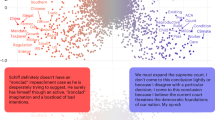 Following ref. 40, we applied the distributed dictionary representation (DDR) approach. We calculated the cosine similarities between the texts’ embedded representations and the two dictionaries’ centroids. The similarity scores range from −1 (not similar at all) to 1 (perfectly similar). As a result, each text had two scores, one representing its belief-speaking value (\({D}_{{{{\rm{b}}}}}^{{\prime} }\)) and the other its fact-speaking value (\({D}_{{{{\rm{f}}}}}^{{\prime} }\)). To account for the influence of tweet length on these scores, we made predictions for each tweet’s scores based on its length, and then we subtracted these predictions from both the belief-speaking and fact-speaking similarity scores. To validate the belief-speaking and fact-speaking measures, raters on the Prolific survey platform were asked to score tweets on scales reflecting their representativeness for belief-speaking and fact-speaking, respectively, and the ratings were used to create a ground-truth dataset to compare against the similarity-based classifier, which showed high performance with AUC scores of 0.824 for belief-speaking and 0.772 for fact-speaking (see ref. 15 for further details).