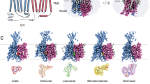 The image processing workflows are illustrated in Supplementary Figs. 3c, 5c and 7d. Super-resolution movie stacks were collected. Motion-correction, two-fold binning to a pixel size of 1.067 Å, and dose-weighting were performed using MotionCor2-1.3.239. The contrast transfer function (CTF) parameters of dose-weighted micrographs were estimated by cryoSPARC-4.5.340. Micrographs with ice or ethane contamination and empty carbon were removed manually. Micrographs with a defocus among −0.7 to −3 μm and with a resolution better than 4 Å were selected for further data processing. Reference-free 2D classification was performed to remove contaminants. The resulting particles were subjected to 3D classification using the initial models generated using cryoSPARC. The classes that showed obvious secondary structure features were selected and subjected to an additional several rounds of 3D classification. The resulting particles were subjected to non-uniform refinement41. To further improve the resolution, seed-facilitated 3D classification42 was performed with particles picked using Topaz43. Several rounds of seed-facilitated 3D classification using good and biased references or references with resolution gradients were performed. The resulting particles were subjected to non-uniform refinement and local refinement in cryoSPARC with the mask of hURAT1, yielding maps with a resolution of 3.34 Å, 2.99 Å, and 3.21 Å for the urate-bound state, benzbromarone-bound state and verinurad-bound state, respectively. All of the resolution estimations were based on a Fourier shell correlation of 0.143 cut-off after correction of the masking effect. Local-resolution maps were calculated using cryoSPARC.