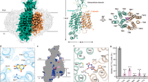 Benzbromarone is a high-affinity hURAT1 inhibitor, which was clinically used for the treatment of gout25. We determined the structure of hURAT1 in complex with benzbromarone to a resolution of 3.0 Å (Supplementary Figs. 5 and 6). In the presence of benzbromarone, the structure exhibits an inward-facing conformation, in which the extracellular vestibule is sealed and the intracellular vestibule is open. Benzbromarone binds at the urate-binding site (Fig. 3a, b). The ethyl-benzofuran group of benzbromarone is surrounded by C32, S35, M36, F241, and H245 of the NTD, and F360, F364, and F365 of the CTD (Fig. 3c). The dibromo-hydroxyphenyl group of benzbromarone forms hydrophobic interactions with F449 (Fig. 3c). Moreover, the side chains of Q473 and N237 form polar interactions with the hydroxyl group and bromine atom of benzbromarone, respectively (Fig. 3c). These structural observations are in agreement with previous data showing mutations, including S35N, F365Y, and F449Y, would decrease the affinity of benzbromarone6,7. To investigate the functional significance of residues interacting with benzbromarone, we mutated them to alanines or their corresponding residues from other OATs (Supplementary Fig. 2), creating the M36T, N237A, F241S, F360T, F364Y, and Q473A mutants. The M36T, F241S, and Q473A mutations significantly reduced urate uptake activity, preventing confident analysis of benzbromarone inhibition (Supplementary Fig. 6d, e). In contrast, the N237A, F360T, and F364Y mutants maintained urate uptake activity similar to hURAT1WT (Fig. 3d, e), but all reduced the potency of benzbromarone to varying degrees. Notably, F360T had the most pronounced effect, highlighting the critical role of F360 in benzbromarone’s potency (Fig. 3f).