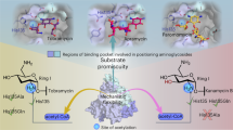 Enhanced sampling simulations were carried out using accelerated molecular dynamics simulations61,62 by adding a boost potential to the dihedral angle energy of all individual atoms in order to lower the energy barriers of the protein system. The 150 ns classical MD simulations were used to determine the parameters for the threshold energy E and the acceleration factor a, and were calculated as \(E=\left\langle {V}_{{dihedral}}\right\rangle+3.5\cdot {N}_{{residues}}\) and \(\alpha=\frac{3.5}{5}\cdot {N}_{{residues}}\) with Nresidues equals the number of protein amino acids and \(\left\langle {V}_{{dihedral}}\right\rangle\) is the average dihedral energy determined from the 150 ns classical MD simulations. Two independent accelerated MD simulations for both ligand-free GdmF and seco-progeldanamycin-bound GdmF were carried out for 600 ns each, starting from the final structures of the 150 ns classical MD simulations.
