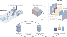 To improve electrochemical H2O2 production, current approaches focus on enhancing the ORR catalytic activity of the cathode and optimizing the cathode structure2,7,8,9. A series of electrocatalysts such as noble metal-based catalysts (Pt–Hg, Au–Pd, Pt/TiC, etc.)10,11,12, nonmetal carbon-based catalysts (nitrogen-doped carbon, oxidized CNTs, etc.)13,14, and M–N–C single-atom catalysts (Co–N–C, Ni3(HITP)2, Fe-CNT, etc.)15,16,17 with suitable binding energy of *OOH intermediate, have been developed to improve 2e− ORR activity and selectivity18. Specifically, the commercial carbon black (CB) itself exhibited fairly high 2e– ORR activity19,20, and boron or sulfur doping could further boost the H2O2 production21. Water oxidation reaction catalysts such as oxygen-deficient Pr1.0Sr1.0Fe0.75Zn0.25O4-δ perovskite oxides and ZnGa2O4 were also developed to produce H2O2 by lowering the overpotential below 1000 mV and increasing faradaic efficiency over 80%22,23. Confining localized oxygen could also boost water oxidation to H2O2 on a carbon paper/PTFE anode with a low overpotential of 640 mV24. Other approaches have been based on optimizing cathode structures by developing enhanced three-phase interfaces for effective charge (electrons and protons) and mass transfer (O2, H2O, and H2O2)25,26. The gas diffusion electrode-based reactor configuration significantly advanced the field by directly using air as an oxygen source and avoiding aeration, which enhanced O2 transfer and improved overall H2O2 production9,27. The utilization of solid electrolytes can further shorten transport pathways and enable continuous extraction of high-concentration H2O228. A superhydrophobic polymethylhydrosiloxane-coated air cathode obtained a high H2O2 production of 1875 mg L−1 at 360 min in single compartment cell29. The integration of hollow fibers in an air cathode boosted O2 transport through the axial microchannel and radial nanopores with about 79.3 mM H2O2 production in 1 h30.