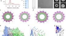 To better understand the molecular interactions among the components that regulate the assembly and function of the EBOV nucleocapsid, we attempted to determine the high-resolution structure of the EBOV NCLS within VLPs using single-particle cryo-EM, which differs from previous studies using cryo-ET7,8. Consequently, we co-expressed NP, VP24, VP35, VP40, and GP in a human cell line, HEK293T (human embryonic kidney) cells, and produced NCLS-containing VLPs that were morphologically indistinguishable from authentic EBOV particles24. Initially, we employed a single-particle analysis, imposing helical symmetry, and determined the helical NCLS structure inside the VLP at an overall resolution of 7.5 Å (Fig. 1a, Supplementary Fig. 1). Our cryo-EM map shows a good fit with the cryo-ET maps of the NCLS in the VLP and the nucleocapsid in authentic virion8 (Fig. 1b). It maintains a consistent helical parameter (Supplementary Table 1), suggesting that our cryo-EM structure accurately represents the native conformation of the EBOV nucleocapsids. The structure of the NP–RNA complex located within the inner layer of the NCLS is analogous to the high-resolution structure as reported previously22 (Supplementary Fig. 2). The external protrusions on the helical NP–RNA complex were presumed to be two VP24 molecules, as also described by previous cryo-ET analysis8. We also detected additional map densities outside the VP24 protrusions that remained uncharacterized, as reported in cryo-ET analysis8 (Fig. 1c, shown in dark gray). Next, to identify the molecular interactions within the nucleocapsid, we focused on its repeating unit, composed of two NPs and two VP24s. We achieved a higher-resolution structure by expanding the helical symmetry and further processing the repeating unit (Supplementary Fig. 1). The resulting map, with a 4.6 Å resolution, facilitated the identification of the NP–RNA complex that constitutes the inner core of the nucleocapsid and the positioning of VP24s on the NP–RNA complex (Fig. 1c, d). Unfortunately, we could not identify the outer map of the VP24 protrusions owing to the limited resolution (Fig. 1c, shown in dark gray). The repeating unit of the NCLS was composed of two adjacent copies of NP-associating RNA and two differently oriented VP24 molecules (Fig. 1c, d): NP-1 (shown in pink) featured a large protrusion of additional density on the outside of the core, which included one copy of VP24-1 (shown in lime green), and NP-2 (shown in beige) had a smaller protrusion that contained one copy of VP24-2 (shown in violet).