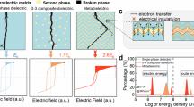 Figure 2c depicts the D–E curves (displacement–electric field) for the core-sheath structural films at an electric field of 300 kV/mm (Extracted from Fig. S5). The curve of P(VDF-HFP) demonstrates a pronounced breadth, indicating low charge/discharge efficiency and significant energy loss during the processes of polarization and depolarization. With the incorporation of PMMA into the sheath and an increase in its content, the D–E curve progressively narrows, indicating an enhancement in the charge/discharge efficiency of the core-sheath structural films. This enhancement can be primarily attributed to two key factors. First, the PMMA sheath suppresses the aggregation of ferroelectric phase P(VDF-HFP), forming numerous linear/ferroelectric interfaces that effectively impede carrier migration through the Poole–Frenkel effect, thereby reducing conduction losses46. Second, the introduction of the linear material PMMA also plays a positive role in reducing the energy loss of the film. The remanent polarization (Pr), charge/discharge efficiency, and discharged energy density of the samples are collected in Fig. 2d. It is observed that the Pr of the core-sheath structural films exhibits a significant decrease relative to pure P(VDF-HFP) sample, and the increased content of the linear polymer PMMA leads to a further reduction in Pr, even though with a more moderate trend. With the restriction of the Pr, the film’s charge/discharge efficiency is enhanced from 63% (for pure P(VDF-HFP)) to 89% (for the 70% core-sheath structural film). Once the PMMA content exceeds 40%, the charge/discharge efficiency stabilizes at a level above 80%. The findings align with the D–E curve data of the core-sheath structural films (Fig. 2c). The merits of the core-sheath structure are further exemplified in Fig. S6, where a comparative analysis of the 40% core-sheath structural film fabricated in this work and the films with the same PMMA content, prepared using the blending method, reveals that the dielectric constant and breakdown strength of the former surpasses those of the latter while maintaining the equivalent dielectric loss. A representative finite element method has demonstrated that the fibrous morphology is more conducive to improving the dielectric constant by rationally allocating the local electric field distribution, as illustrated in Fig. S7. This simultaneous enhancement of both dielectric constant and breakdown strength at a given mass fraction addresses the inherent conflict between the two parameters. It is attributed to the core-sheath structural film fabricated via electrospinning technology ensuring uniform dispersion of P(VDF-HFP) within the PMMA matrix. Figure S8 presents a trend chart for the dielectric constant and breakdown strength of the core-sheath structural films with varying PMMA compositions. Given that discharged energy density depends on both the dielectric constant and breakdown strength, a nano-submicron PMMA surface layer is designed for the 30% and 40% core-sheath structural films to further enhance the energy storage capabilities of the dielectrics.