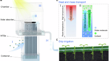 For effective and sustainable water harvesting in greenhouses, passive SAWH systems can be installed in various parts of the greenhouse, in addition to centralized treatment of vapor. One potential location is the greenhouse roof. Referring to the structure of photovoltaic greenhouses41, an water harvesting greenhouse driven by photothermal energy can be made by covering part of the roof of the greenhouse with SAWH materials, absorbing at night and desorbing with irradiation during the day (Fig. 2b). This SAWH-cover greenhouse operates by adsorbing high-moisture water vapor from the surrounding environment during the night in an open adsorption process. During the day, sunlight is harnessed to desorb the adsorbed moisture, converting it into liquid irrigation water. This cyclical process allows for the efficient collection of irrigation water directly from the greenhouse roof, which is expected to obtain irrigation water in regions with abundant sunlight but scarce water resources. Some HPPs with good adsorption effects in low-humidity environments30,42,43 can adapt to this application scenario. Given a 50% roof installation area, the SAWH cover equipped with HPPs30 is capable of collecting ~453.87 g m−2 of irrigation water, which equates to roughly one-third of the daily water requirements of the crops (Fig. 2f). This efficient water collection method underscores the potential of the SAWH hood in promoting sustainable agricultural practices by optimizing water usage. Another potential location for the installation of SAWH systems is ventilation positions such as side windows of greenhouses. Polytetrafluoroethylene membranes44 and other materials can be used to transform HPPs into filter screens that only allow dry air to pass through without allowing water vapor to pass through. In this case, high-concentration water vapor can be effectively collected and reused during ventilation.