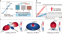 The high-pressure XRD measurements results revealed that as the applied pressure increased, the intensity of the diffraction peaks corresponding to λ-(20-3) and λ-(203) gradually diminished, while the diffraction peaks associated with β-(20-3) and β-(003) gradually intensified, suggesting a gradual phase transition from the λ to the β-phase (Fig. 3d and Supplementary Figs. 41 and 42). The cross-pressure for the phase transition of λ-Al0.12Ti2.88O5 was estimated to be approximately 557 MPa (Supplementary Fig. 43). The similar phase transition from the λ to the β-phase was also observed in λ-MxTi3-xO5 (M = Mg, Sc, V, Cr, Mn, or Fe) (Supplementary Figs. 44–50). Figure 3e and Supplementary Fig. 51 show that as the temperature increased from 300 K (25 °C) to 363 K (90 °C), the diffraction peaks of β-(20-3) and β-(003) gradually weakened, while the diffraction peaks of λ-(20-3) and λ-(203) gradually strengthened. This result indicated the gradual transition of the β-phase into the λ-phase with an estimated crossover temperature of ~363 K (Supplementary Fig. 52). Upon further heating to 403 K, the diffraction peaks for the β-phase nearly vanished, indicating the transition from the β-phase to the λ-phase was completed. At high temperatures (>453 K), the λ-phase undergoes a second-order phase transition to the α phase, but then it reverts to the λ-phase upon cooling. Therefore, during the cooling process, the α-phase underwent a phase transition to the λ phase that existed stably in the temperature range of 403–300 K. A similar phase transition from β-phase to λ-phase was also observed in β-MxTi3-xO5 (M = Mg, Sc, V, Cr, Mn, or Fe) (Supplementary Figs. 53–57). Furthermore, the enthalpy during the β→λ phase transition directly reflected the heat storage capacity of β-MxTi3-xO5. The differential scanning calorimetry test results showed that, except for β-MnxTi3-xO5, the above pressure-treated samples exhibited significant endothermic peaks, with β-AlxTi3-xO5 having more pronounced heat storage capabilities (Fig. 3f and Supplementary Fig. 58). When x decreased from 0.13 to 0.10, the phase transition enthalpy of β-AlxTi3-xO5 increased from 15.70 J/g (3.51 kJ/mol) to 21.78 J/g (4.87 kJ/mol), and the phase transition temperature increased from 351 K to 371 K. It is noted that β-AlxTi3-xO5 had an excellent heat storage performance, showing reversible phase transition characteristics under the influence of external pressure and temperature. However, the phase transition pressure from λ to β still required several hundred MPa, making the application limited.