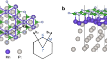 where Si/j is the spin of each Mn ion. Considering two Mn layers associated with the exchange coupling J1 (as illustrated in Fig. 1a in the main text), we have \({\sum }_{ij}\vec{{S}_{i}}\cdot \vec{{S}_{j}}=\pm 3| {S}^{2}|\) for the parallel/antiparallel alignment. Consequently, this can be expressed as \({J}_{1}=\left({E}_{F,1}-{E}_{AF,1}\right)/6| {S}^{2}|\), where EF,1 − EAF,1 is the energy difference between the parallel and antiparallel alignments for a pair of nearest neighboring moments. J2 and J3 were calculated in the same methodology. The exchange parameters were found to be x = 0.2449 and y = − 0.1203 from the DFT calculation, in remarkable correspondence to the values used in our simulated hysteresis curves.