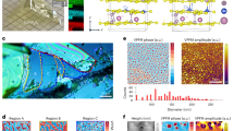 The PFM measurements were performed using the Asylum Research MFP-3D and Cypher. Both the dual AC resonance tracking PFM mode and vector PFM mode were used to acquire useful electromechanical responses. Commercial soft conductive probes (e.g., AC 240 TS with a spring constant of 2 N/m and ASYELEC-01-R2 with a spring constant of 2.8 N/m) were adopted to avoid damaging sample surfaces. AC biases of 0.2 to 0.5 V were applied onto the PFM probes to image polar textures with scanning points of 320 to 512 and a scanning rate of 1.5 Hz. Vector PFM mode can simultaneously record out-of-plane and in-plane electromechanical responses at a free-air resonance and contact resonance frequency, respectively. In particular, for in-plane responses, the dipole perpendicular to the PFM cantilever can be precisely detected by the torsional vibration of PFM probes. When conducting the angle-dependent PFM measurement, the CuInP2S6 sample was manually rotated, and the exact angles were calibrated by comparing the initial and rotated PFM mapping. When carrying out the mechanical switching measurement (Fig. 3a), the AC probe biases were turned off except for 1st and 6th scanning.