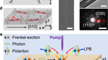 Strong coupling between the organic Frenkel excitons and the photonic modes was theoretically investigated by a coupled oscillator model (Supplementary Note 1). Figure 1f exhibits the calculated exciton-polariton dispersion in the organic metasurface. Unlike the pure photonic modes 0 and 2 with almost constant curvatures, the polariton dispersion curvatures become smaller at short wavelengths and large angles, which is a typical result of strong coupling14,53,54,55. Figure 1g presents the angle-resolved microphotoluminescence (AR μ-PL) spectrum from a typical organic metasurface under non-resonant continuous-wave excitation at room temperature (Supplementary Fig. 10). Notate that there are many breakpoints in polariton dispersion curves away from the Γ point, which are induced by the weak radial modes confined in the PMMA layer (Supplementary Fig. 11)56. The experimentally measured dispersions of modes 0, 1, and 2 are in good agreement with the theoretically calculated polariton dispersions, indicating the occurrence of strong exciton-photon coupling in the organic metasurface. The strong coupling regime is also evidenced by a distinct anticrossing behavior of the lower and upper polariton branches in the reflectance spectra (Supplementary Fig. 12) and a bending effect of lower polariton branches in the PL spectra (Supplementary Figs. 13 and 14)54,57. The dispersions of polariton modes 1 and 2 reveal two dark states at the Γ point corresponding to two polariton BICs with non-radiative nature21. The Q factors of the polariton mode 2 exhibit a sudden divergence at the Γ point (Supplementary Fig. 15), confirming the formation of polariton BIC236. Such polariton BICs featuring ultrahigh Q factors would contribute to the realization of low-threshold polariton lasing.