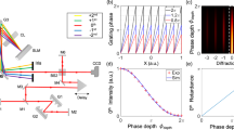 where \(0\le M\left(x,\Omega \right)\le 1\) is the phase scaling coefficient, \(N\left(x,\Omega \right)\) is determined by \({\widetilde{\psi }}_{{{{\rm{tar}}}}}\left(x,\Omega \right)\), and \(\varLambda\) is the period of a 1D grating in the temporal frequency \(\Omega\)-axis. After a Taylor-Fourier expansion, one can see that the +1 order diffracted field after being modulated by \(\varphi \left(x,\Omega \right)\) is equal to \(-{{{\rm{sinc}}}}\left(\pi M-\pi \right)\exp \left(i\left(N+\pi M\right)\right)\). By letting \(-{{{\rm{sinc}}}}\left(\pi M-\pi \right)=\left|{\widetilde{\psi }}_{{{{\rm{tar}}}}}\right|\) and \(N+\pi M={\tan }^{-1}\left(\frac{{{{\rm{Im}}}}\left(\,{\widetilde{\psi }}_{{{{\rm{tar}}}}}\right)}{{{\mathrm{Re}}}\left(\,{\widetilde{\psi }}_{{{{\rm{tar}}}}}\right)}\right)\), we obtain: