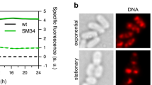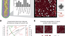 The E. coli K12-derived strain BW25113 was used in all experiments, together with the “P1 Long” mutant23,58, with an incorporated reporter cassette in the chromosome, containing a Kanamycin resistance gene and the rRNA operon promoter rrnBP1 followed by a GFP expressing gene (the same as in ref. 23). Cells were grown in a M9 minimal growth medium complemented with 1% glucose (glu), until the shift to 1% glucose and 1% Casamino Acids (glu+cAA).