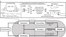 where (\(\tilde{\epsilon }\)) is the theoretical maximum value of the elongation rate and kC sets a sensitivity scale. The concentration of charged tRNAs is, in turn, influenced by the pool of available amino acids, which affects the dynamics of tRNA charging. We assume a simple relationship between uncharged tRNAs and cognate amino acids: [tRNAC] ∝ ψA, i.e. that the fast time-scale changes of precursors are instantaneously mirrored by tRNA charging. For a detailed motivation of this assumption please refer to Supplementary Note 2. Following this assumption, we write