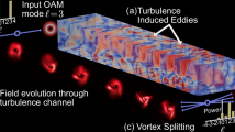 Turbulence is a universal phenomenon that occurs in the atmosphere, the oceans, the wake of a boat, and even in galaxies16,17,18,19. Atmospheric turbulence leads to beam wandering, scintillation, and, most importantly, phase front distortion, primarily caused by random temperature variations and convective processes. Although some of these effects can be compensated by using aperture averaging20, phase distortions are more difficult to counteract. While the exact theoretical modeling of turbulent flows is one of the most challenging problems of modern physics, the Kolmogorov model for turbulent flow accurately describes turbulence by relating random temperature variations and convective processes that perturb the wavefront of the optical beam to refractive index fluctuations. There are two characteristic parameters used to describe the turbulence: an inner scale, \({l}_{0},\) which is typically on the order of millimeters and results in distortions of the wavefront of the beam, and an outer scale, \({L}_{0}\), which is on the order of meters and is associated with beam wandering21. In particular, the Kolmogorov model assumes \({l}_{0}=0\) and \({L}_{0}\to \infty\). As for many random processes, theoretical descriptions of turbulence rely on statistical averages for the random variations of the refractive index of the atmosphere. However, experimental results confirm that such statistical descriptions are accurate in most practical cases22,23.