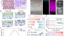 Continuous Hf0.5Zr0.5O2 thin films were grown by ALD (TFS 200, Beneq) at 200 °C on a Si substrate coated with 10-nm-thick TiN bottom electrodes, where hafnium tetrachloride (HfCl4) and zirconium tetrachloride (ZrCl4) precursors were used, with water (H2O) as the oxidizing reactant and argon (Ar) acting as a purging gas. A 1:1 ratio between the alternately laminated HfO2 and ZrO2 atomic layers (~1 nm) was used to set the desired stoichiometry for a deposited film with a total thickness of 10 nm. The film thickness can be determined from XRR using a Cu Kα source (D2, Bruker) and HAADF-STEM (Fig. 3a and Supplementary Fig. S2a, b), and the film compositions can be determined from EDS mapping of alternative Hf and Zr stacking layers (Supplementary Fig. S2c). TiN and W electrode layers were deposited by sputtering (PVD-75, Kurt J. Lesker) at room temperature. The thermal annealing process for Samples 1 and 2 was performed at 550 °C for 30 s in an N2 atmosphere to enable crystallization of the HZO before and after etching of the top electrodes, respectively (Supplementary Fig. S1a, b). After photoresist layer patterning of the top electrodes using ultraviolet photolithography (NQX4006, Neutronix-Quintel), the top electrodes were etched into square/circular shapes with side lengths/diameters of l, respectively, via ion milling using SF6 and O2 plasmas with gas flows of 15 and 5 sccm, respectively, at an output power of 50 W for 30 s in a reactive ion etching system (RIE-10NR, Samco, Japan). Near-edge implantation of the oxygen vacancies occurs during etching (Supplementary Fig. S1c). The capacitor dimensions were verified using planar-view SEM (Sigma HD, Zeiss) images (Supplementary Fig. S4). Leakage current-voltage curves were measured using an Agilent B1500A semiconductor analyzer operating in voltage-sweep mode (Supplementary Fig. S5a). The valence states analysis of Zr, O, and Hf within the HZO was performed on an XPS (Thermo Fisher ESCALAB 250Xi) using Al Kα emission in an energy of 1486.6 eV. After the deconvolution of the XPS spectra (Supplementary Fig. 4Sa–f), it is found that the lattice oxygen and non-lattice oxygen coexist at binding energies of 529.9 eV and 531.2 eV within the ion-implanted crystallized HZO, respectively. Their energies shift by 0.65 eV within the ion-implanted amorphous HZO. From the area integrations of these peaks, we conclude that the non-lattice oxygen content in the latter film increases by 16%.