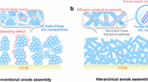 The analysis of electrode kinetic and mass-transport-related losses is conducted by subtracting the total Ohmic loss, referred to as HFR-free cell voltage. Figure 4b illustrates the Tafel plots of the iR-corrected cell voltages, and the Tafel slopes are determined by fitting the data from 0.01 A cm−2 to 0.1 A cm−2 (inset of Fig. 4c), where the mass-transport related loss is considered negligible. At low current densities (≤0.1 A cm−2), the HFR-free cell voltages with the two anodes exhibit close proximity to each other. Tafel slopes of 41.5 ± 1.4 mV dec−1 and 39.6 ± 0.8 mV dec−1 are obtained from HP-IrOxHy-BM and IrOxHy-AA, respectively. It is then reasonable to conclude that the kinetic losses for the two anodes are nearly identical, i.e., \({\Delta \eta }_{k}\approx 0\). Then, the observed \({\Delta \eta }_{{overall}}\) can be predominantly attributed to the mass-transport-related loss (\({\Delta \eta }_{m}\)) within the anode catalyst layer.