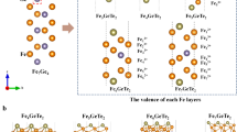 To better understand the structure of the reconstructed Fe[001]/Fe3O4[001] interface region, we employed density functional theory (DFT) calculations to search for its thermodynamically most stable configurations. The results are presented in full details in Supplementary Fig. 7. Considering the DFT structural parameters of BCC-Fe and Fe3O4 (see Supplementary Table 1), the stacking of the two layers results in an in-plane lattice mismatch of \({\varepsilon }_{xy}^{{{{\rm{BCC}}}}\,{\mbox{-}}\,{{{\rm{Fe}}}}}=-4.5\%\) and \({\varepsilon }_{xy}^{{{{{\rm{Fe}}}}}_{3}{{{{\rm{O}}}}}_{4}}=+ 4.7\%\), with respect to the other layer, respectively.