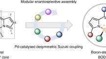 Boron-containing compounds are widely used as dyes in medicinal research and materials science. Boron dipyrromethene dyes (BODIPYs), as a family of representative tetracoordinate boron molecules, have grown as one of the most popular organic fluorophores during the past few decades, owing to their excellent photophysical properties, including high photostability, molar absorption coefficients, and fluorescence quantum yields1,2,3,4,5. Furthermore, their abundant reaction sites provide diverse structural modification to achieve distinctly photophysical properties6,7,8,9,10,11. Among them, the construction of chiral BODIPYs attracts particular attention because of the great potential of circularly polarized luminescence (CPL) in optical displays12,13,14,15, information storage and processing16,17, and bioprobes18,19. Recently, couple of chiral BODIPYs were exploited by synthetic chemists, while most of them relied on resolution by HPLC or asymmetric synthesis induced by chiral substrates (Fig. 1a)20,21,22,23,24,25,26,27,28,29,30. Asymmetric catalysis has been regarded as one of the most efficient strategies for the construction of chiral compounds31,32,33,34,35, while introducing asymmetric catalysis to achieve chiral BODIPYs remains rare. Considering the excellent atom economy, generality, and efficiency, it is highly desirable to access chiral BODIPYs via asymmetric catalysis as a versatile tool.