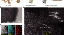 All electrochemical measurements were conducted on an electrochemical workstation (CHI 660E) with a high-current amplifier (CHI 680C). The electrolyte was 1.0 M KOH (pH = 13.69 ± 0.02). For the preparation of 1.0 M KOH, 56.11 g KOH solid was dissolved in 500 mL DI water with stirring for 20 min; then, the solution was transferred into 1 L volumetric flask by adding DI water to the volume. Finally, the 1.0 M KOH solution was stored in polyethylene bottles at room temperature. For a standard three-electrode setup, the catalyst/NF sample was directly applied as a working electrode with a geometric area of 0.5 cm2 (i.e., 0.5 × 1 cm) immersed into the electrolyte. A graphite rod was employed as the counter electrode. A Hg/HgO electrode or an Ag/AgCl electrode with a salt bridge was used as the reference electrode. For the benchmark samples, 5 mg of IrO2 was dispersed into a solution containing 450 μL of ethanol and 50 μL of Nafion solution (5 wt%), followed by 2 h of sonication to produce a homogeneous ink. Subsequently, 50 μL of ink was drop-casted onto a pure NF surface (geometric area: 0.5 × 1 cm; mass loading: 1 mg cm−2).