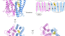 In addition, Cys415 and Cys440 form a disulfide bond to stabilize TM6 (Fig. 1d). A cholesterol molecule is located at a groove formed by TM2 and TM9-10, which may stabilize the intracellular half of TM9 (Fig. 1b, e). We also observed another lipid that resembles phosphatidyl ethanolamine with an aliphatic tail sticking into a pocket formed by TM2 and TM4-5, with the hydrophilic head located underneath H2 (Fig. 1b, f). Overall, XPR1 forms a closed homodimer with abundant lipids contributing to its assembly.
