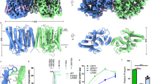 We observed a C-terminal plug-in loop inserted into the inward-facing cavity of the XPR1 protomer. The position of the plug-in loop inside the cavity is stabilized by the interactions between the cytosolic extension of TM10 and the cytosolic cavity formed by TM5-8 and TM10 (Fig. 4a). Glu622 and Phe623 in the plug-in loop form critical interactions with the TMD. Based on these observations, we have designated this sequence as the “Glu622/Phe623 motif” (Fig. 4a). As illustrated in Fig. 4a, Glu622 forms a salt bridge with Arg472 from TM7. Phe623 engages in π–π stacking interactions with Phe391 and Phe394 from TM5, while also participating in a cation–π interaction with Arg466 from TM6. Notably, all these residues are highly conserved (Supplementary Fig. 4). To investigate the potential inhibitory role of the Glu622/Phe623 motif on XPR1’s phosphate export activity, we engineered a double mutant by substituting both residues with alanine (E622A/F623A). Remarkably, this double mutant exhibited a significantly enhanced rate of phosphate export activity compared to the WT-XPR1 (Fig. 4b, c). These findings provide compelling evidence for an auto-inhibitory function of the Glu622/Phe623 motif in regulating XPR1 activity.