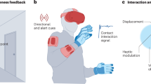 The VR haptic interaction scene in Fig. 5b was written using the Unity platform. The scene is simulated on a personal computer and displayed in the VR headset via USB streaming. The VR headset used here is the Oculus Quest 2 by Meta. The scenario provides a virtual environment within a home in which the user can walk freely and control the position of their hands using VR controllers. When the grip button on the back of the controller is pressed, the character extends its index finger and captures the position of the finger pointer in real time. When the fingertip approaches the cyan area that represents recognition in Fig. 5b, the VR program sends the position of the finger relative to the center of the CRS recognition area \(({x}_{f},{y}_{f},{z}_{f})\) to MATLAB via UDP communication for conversion into haptic signals, where the \({z}_{f}\) direction is perpendicular to the recognized region. The shape of the display of the 2D CRS is determined by the equation